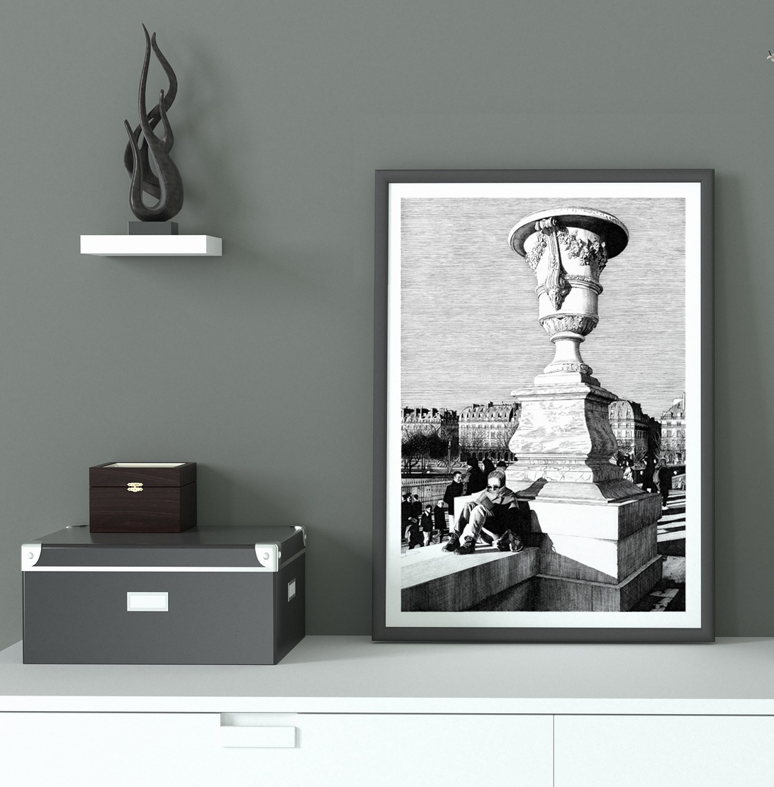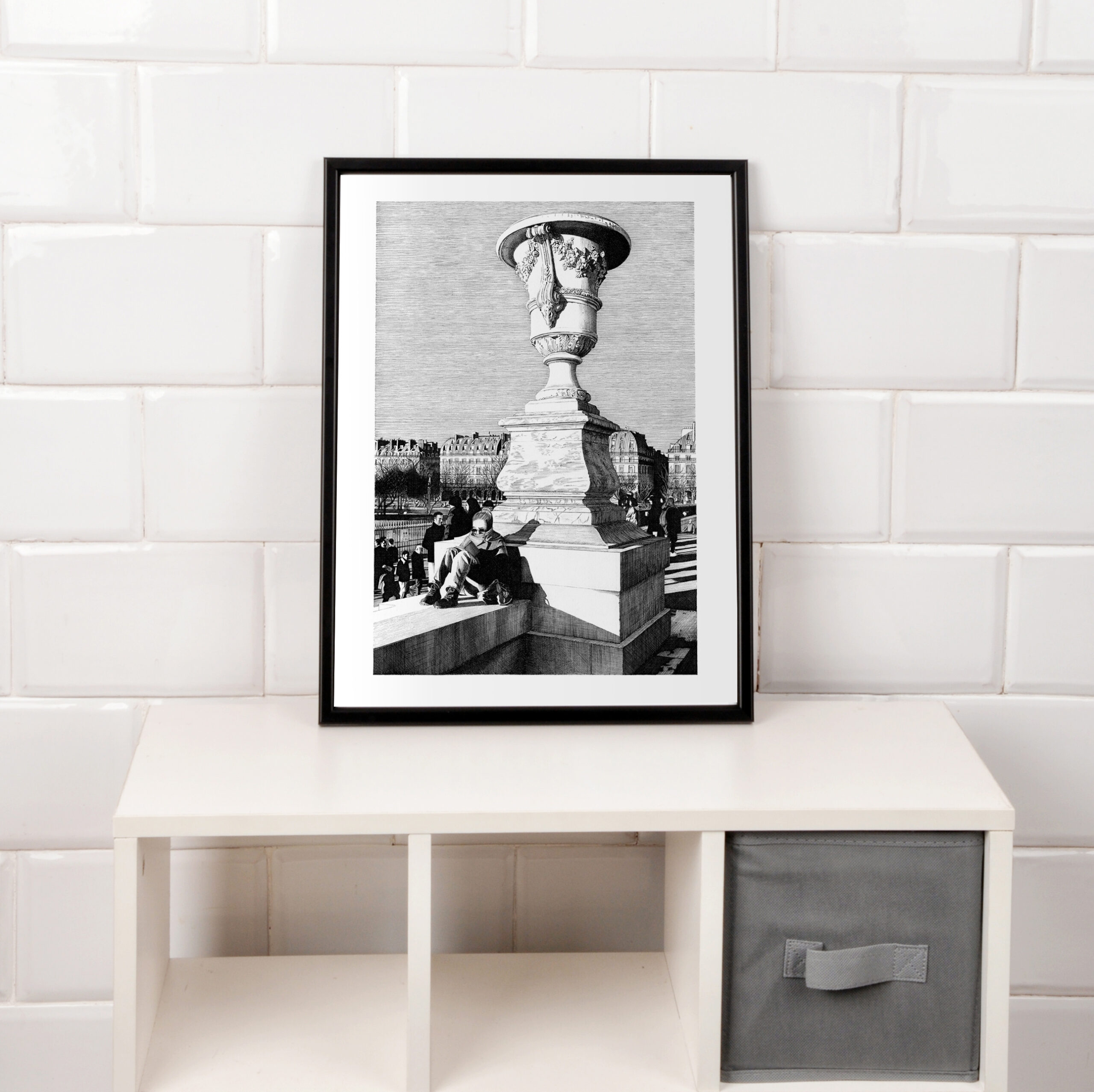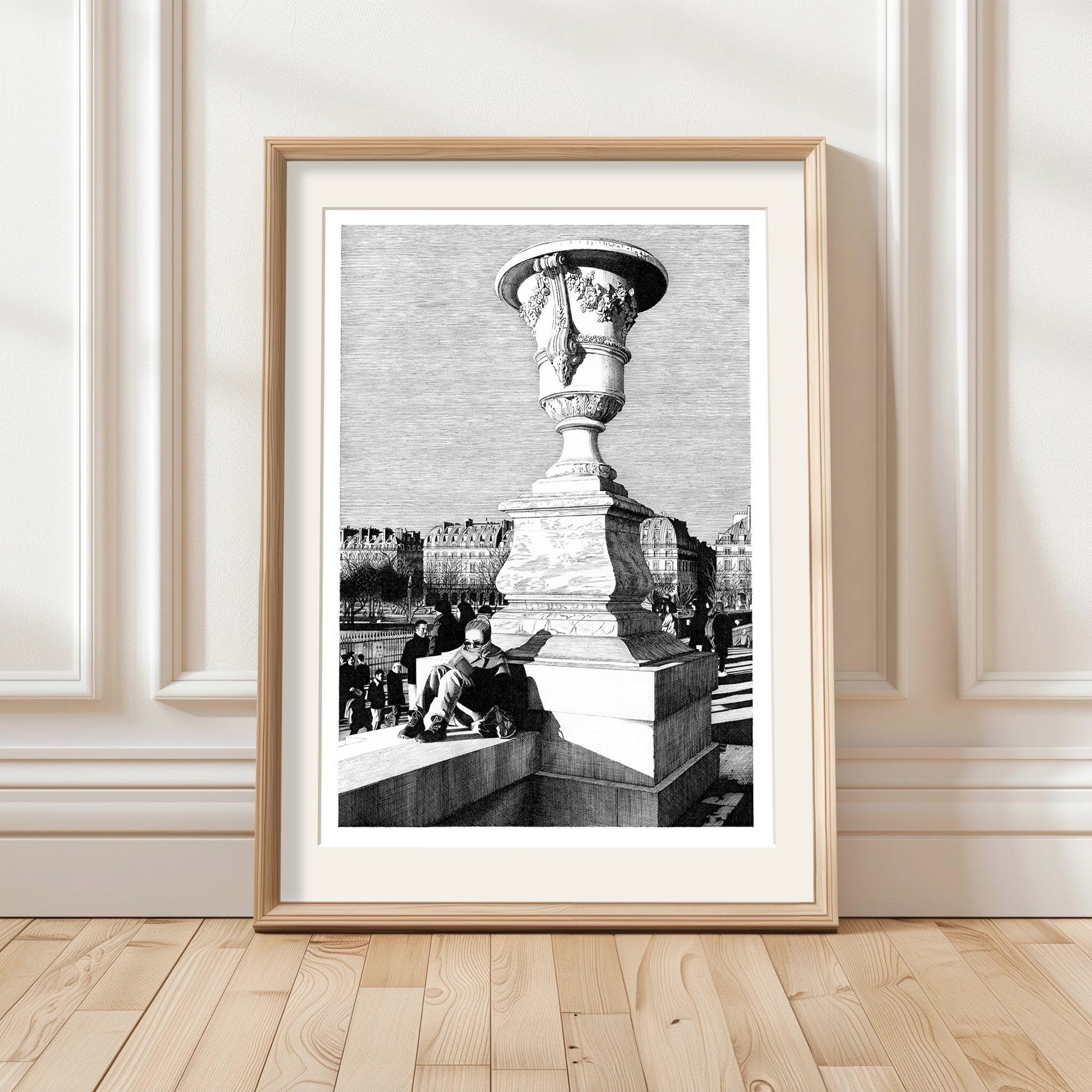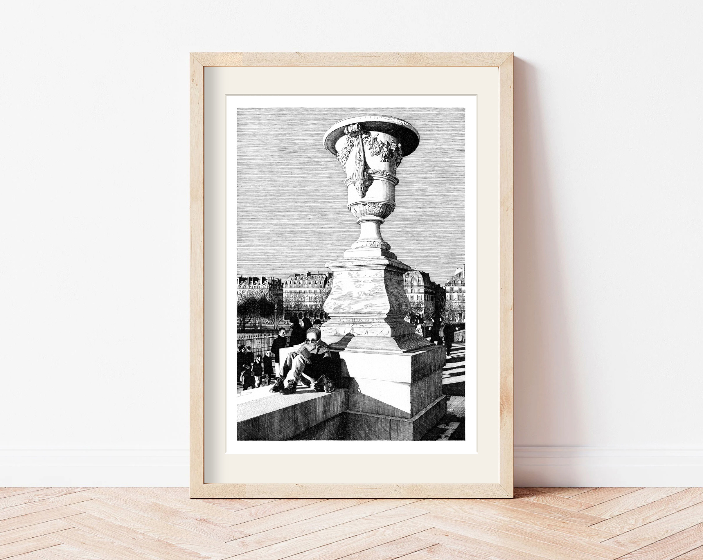 Ce dessin est né de mon amour pour l’architecture, les scènes de genre, ainsi que les ambiances entre ombres et lumière. Je l’ai réalisé à partir d’une photo que j’ai prise à côté du jardin des Tuileries à Paris, et j’ai voulu mettre en valeur cette jeune femme plongée dans sa lecture alors que le monde s’active autour d’elle.